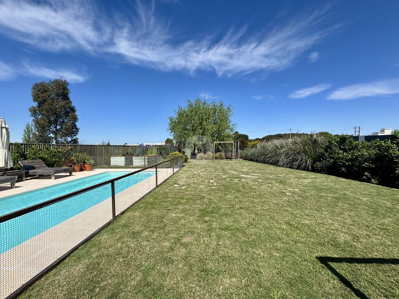 Gran jardín con piscina y deck.