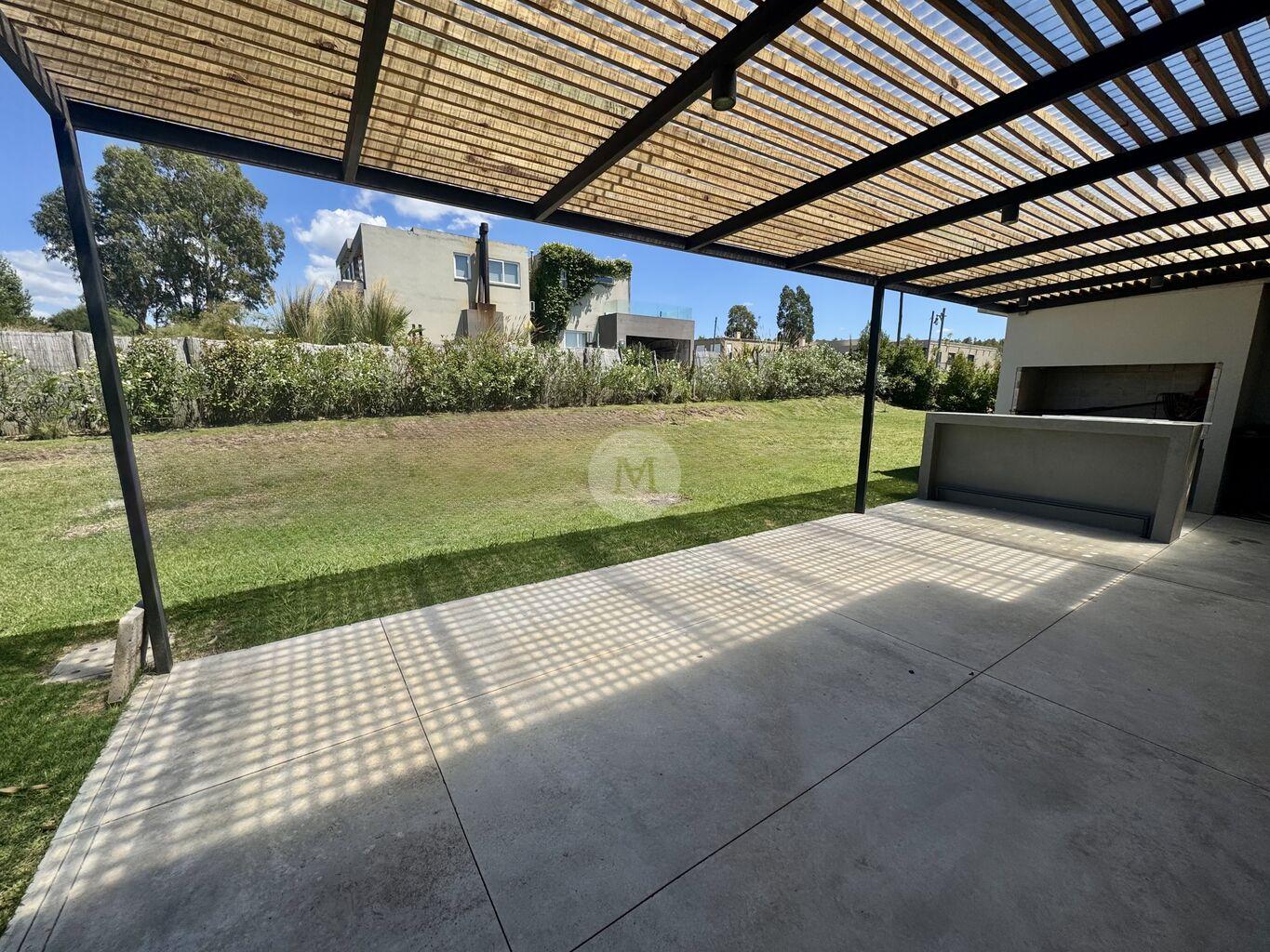 Al fondo pérgola con parrillero y barra. Jardín.